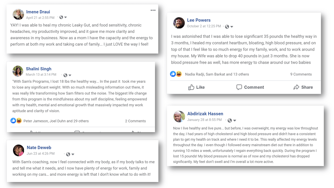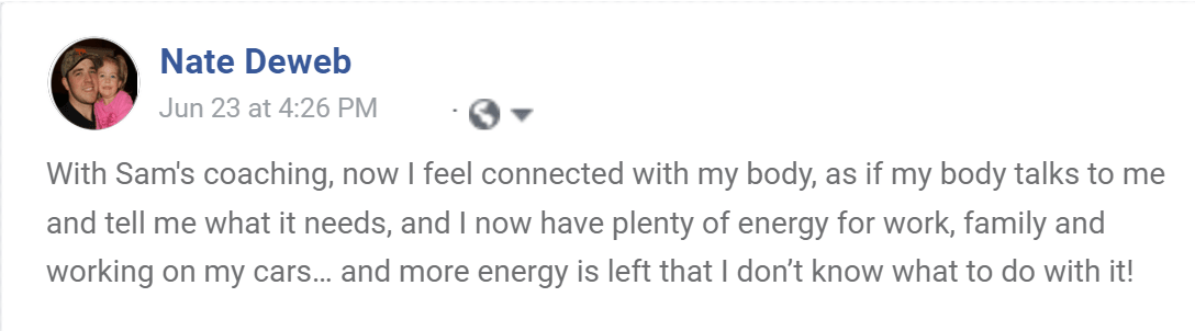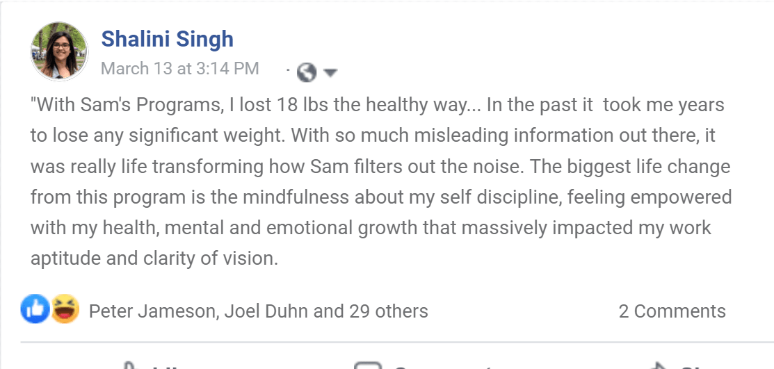"Sam is enduringly positive, yet straight and to the point. He doesn’t practice an empty encouragement made of platitudes and nice sounding words. He gives it to you straight and convinces you that your health goals are attainable; by you, by anyone."